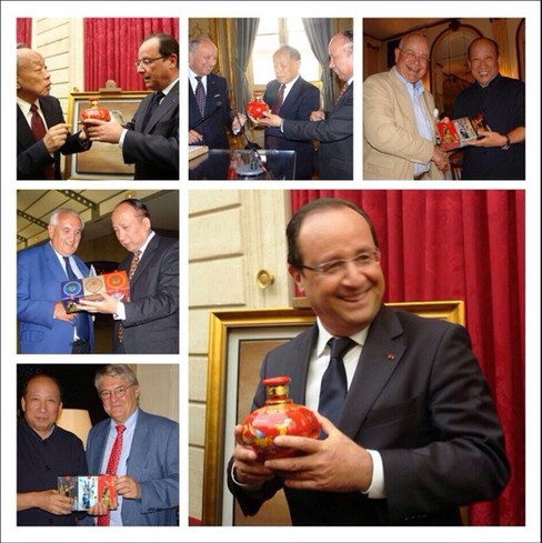 近日,中国人民外交学会会长李肇星部长率代表团访问法国,在法国巴黎爱丽舍宫受到法国现任总统奥朗德,外交部长法比尤斯,议长拉法兰等多位政要的热情接待,期间李部长特意将一款红灯笼造型的京味国礼“皇城根”白酒赠送给了多位法国政要们,总统和政要们看到礼物后十分惊喜,并赞赏皇城根酒非常具有中国文化特色,很精美!