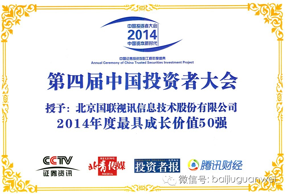 《中国白酒杂志出版商-国联股份近日喜获第四届中国投资者大会颁发的“2014年度最具成长价值企业50强”荣誉称号。1月10日,由CCTV证券资讯频道、北青传媒、腾讯财经、中国国际商会联合主办的第四届中国投资者大会在无锡隆重开幕。大会以其鲜明的务实特征和求是的态度,对在2014年度行业表现突出的企业进行了颁奖和鼓励,所有奖项都通过专家的严格评审和网络投票产生。国联股份与阿里巴巴、联想控股、远东控股等数十家企业同台领奖...