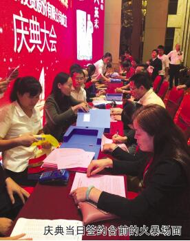 据悉,只要购买5坛金丰60周年庆典酒,就有资格以每股3元的价格认购10000股原始股。金丰投资还承诺,如果不能在6年内实现主板上市,大股东将以每股6元的价格回购这些原始股,相当于开出双倍对赌。记者在现场看到,认购签约台被人群包围,收银台出现长时间排队。