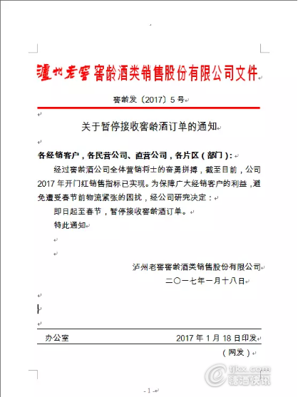 通知主要内容为: 公司各销售公司已基本实现2017年相关大单品的开门红销售目标;为巩固深化2016年市场基础成果,扎实推进2017年销售工作,保证春节后各大单品的价格表现稳定,同时为避免春节前因物流紧张问题对经销商客户及各环节渠道利润造成困扰,公司决定暂停国窖1573、泸州老窖窖龄酒、头曲、二曲接收订单。