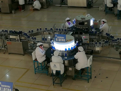 图为洋河包装物流车间内的灯检区,工人们在检查产品外观质量