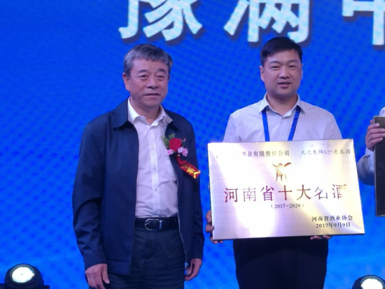 9月9日下午,在第七届中国(贵州)国际酒类博览会上,河南省人民政府主办,河南省商务厅承办的“豫满中华,豫酒推介会”在贵州省贵阳国际生态会展中心举行,张建设再次从中国酒业协会理事长王延才手中接过天之基老基酒荣获“河南省十大名酒”奖牌。