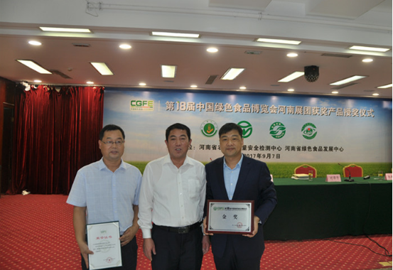 金秋九月丹桂飘香,豫坡老基荣登金榜。9月7日上午,第十八届中国绿色食品博览会河南展团获奖产品授奖仪式在郑州举行,豫坡集团董事长张建设从省农业厅副厅长刘保仓手中接过了天之基荣获第十八届全国绿博会金奖奖牌,并代表获奖企业发言,这已是天之基连续两届被评为金奖。