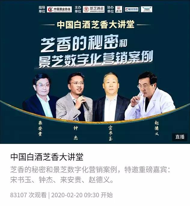在2月20日首期《中国白酒芝香大讲堂》直播中,中国酒业协会副理事长兼秘书长宋书玉,源坤教育创始人、中国白酒品鉴知识普及推广第一人钟杰,中国白酒工艺大师、景芝酒业总经理来安贵,中国白酒大师、景芝酒业常务副总经理赵德义,海纳机构总经理吕咸逊等行业大咖、白酒专家,围绕“芝香的秘密和景芝数字化营销案例”主题进行了直播讲解,获赞无数——