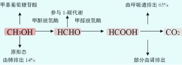 由于甲醇氧化分解慢,从体内排出也慢,因此在人体内毒性作用也较强。未被氧化的甲醇可经呼吸道及肾排出体外,另一部分也可经胃肠道缓慢排出。甲醇代谢途径如图所示。