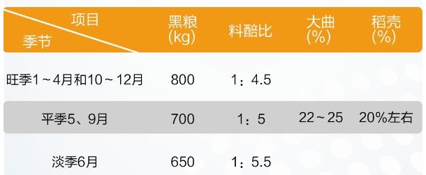 凉糟后入池酒醅参数要求(旺季1~4月和10~12月):温度18℃~22℃、淀粉含量20%~22%、酸度1.2°A~1.8°A、水分54%~57%;(淡季6月):温度低于室温1℃~2℃、淀粉含量18%~20%、酸度1.4°A~2.2°A、水分56%~59%;(平季5、9月):适度调控,低温入池,控酸控淀,利于压排与转排。