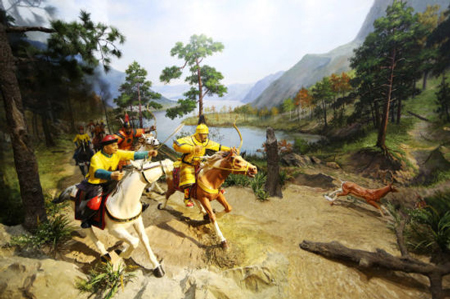 康熙皇帝为了提高士兵的素质,巩固与北部少数民族的关系,抵御沙俄的入侵选址塞外,设立了木兰围场。这里的微缩模型场景即表现了当时康熙皇帝狩猎的飒爽英姿。一日的狩猎结束后,官兵们会论功行赏,在营寨点起篝火、喝起烧酒,以示庆祝。