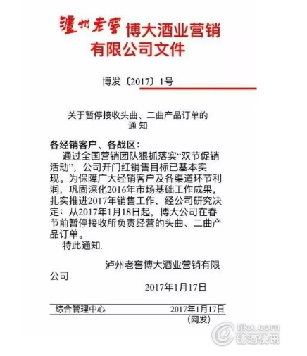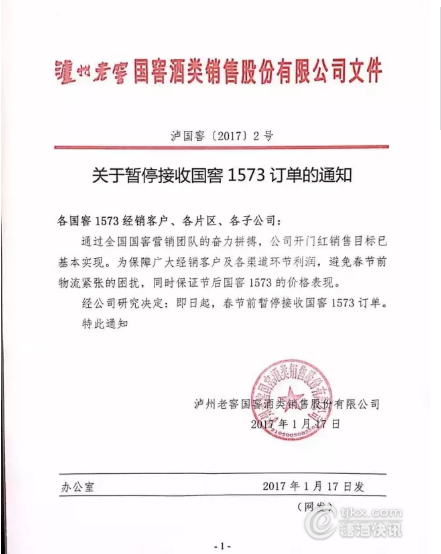 通知主要内容为: 公司各销售公司已基本实现2017年相关大单品的开门红销售目标;为巩固深化2016年市场基础成果,扎实推进2017年销售工作,保证春节后各大单品的价格表现稳定,同时为避免春节前因物流紧张问题对经销商客户及各环节渠道利润造成困扰,公司决定暂停国窖1573、泸州老窖窖龄酒、头曲、二曲接收订单。