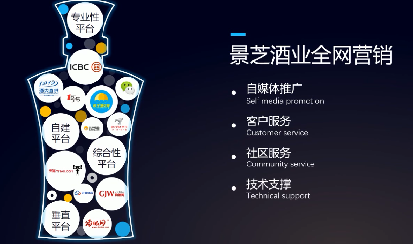 百亿征程离不开营销模式创新,景芝酒业2017年互联网战略发布。自2011年成立电子商务部,景芝酒业以互联网思维推动组织、技术、模式创新,开启了白酒+互联网的产业新模式。凭借金融服务、平台增值服务、技术服务输出和PB战略四个版块,极优佳营销新平台规划在2019年实现整体盈利,并最终实现以品牌商、经销商、终端店、消费者为核心的极优生态圈和以总部基地、云数据基地、创新孵化基地、智能物流基地为中心的极优产业蓝图。
