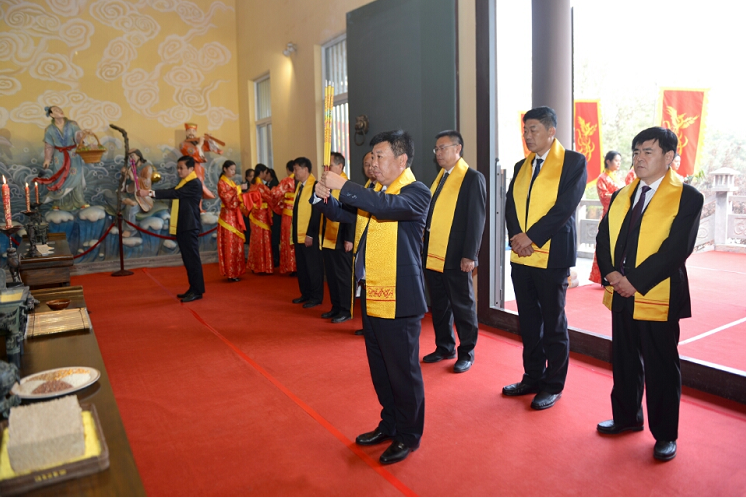 “击鼓九通,鸣金九响,歌舞告祭”,在演绎舜帝九五至尊的声乐中,主祭景芝酒业公司董事长刘全平,率公司常务副总经理来安贵,副总经理赵德义登上酒祖大殿,经洗尘礼、沃盥礼、熏香礼后,向大舜酒祖、仪狄、杜康奉香献馨,恭行敬礼。