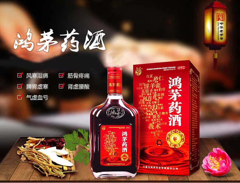 据鸿茅药酒网站介绍,“鸿茅药酒始创于1739年,由著名民间药王王吉天在内蒙古凉城鸿茅镇创办的‘荣盛坊’根据祖传秘方炮制,成分包括(六十七味):何首乌、地黄、白芷、山药、五倍子、广藿香、人参、桑白皮、海桐皮、甘松、独活、苍术、川芎、菟丝子、茯神、青皮、草果、山茱萸、附子、厚朴、陈皮、五味子、牛膝、枳实、高良姜、山柰、款冬花、小茴香、桔梗、熟地黄、九节菖蒲、白术、槟榔、甘草、当归、秦艽、红花、莪术、莲子、木瓜、麦冬、羌活、香附、肉苁蓉、黄芪、天冬、桃仁、栀子、泽泻、乌药、半夏、天南星、苦杏仁、茯苓、远志、淫羊藿、三棱、茜草、砂仁、肉桂、白豆蔻、红豆蔻、荜茇、沉香、豹骨、麝香、红曲等。主要功效包括:祛风除湿、补气通络、舒筋活血、健脾温肾。适用于以下病症:风寒湿痹、筋骨疼痛、脾胃虚寒、肾亏腰酸及妇女气虚血亏。”