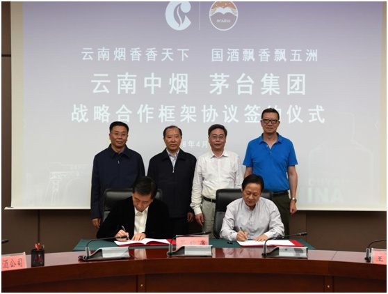 4月19日,中国烟酒行业最具代表性的云南中烟与茅台集团齐聚赤水河畔,举行战略合作框架协议签订仪式,寻求跨界合作发展,这是双方优势互补、强强联合,实现合作共赢的积极尝试和重要举措。