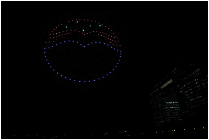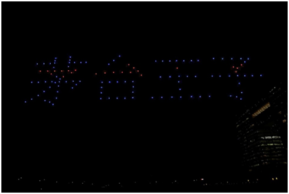 随后酒瓶慢慢倾斜,瓶盖打开,一滴酒滴入酒海随后酒瓶消失不见,无人机矩阵随后变化出“茅台王子”字样、酒盒形状、“茅台股份”的LOGO等图形,似展翅的雄鹰飞过海面,蓝色与红色的灯光在空中流转,预示着茅台王子业绩长红。