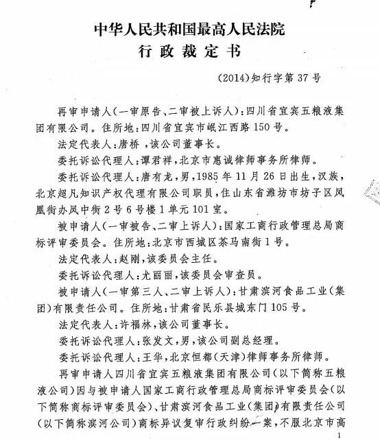 • 最高法院判决,“滨河九粮液”商标合法有效