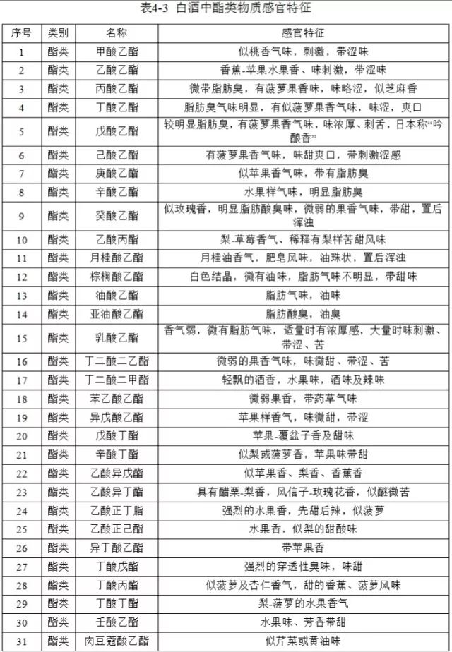 在酒体中,酯类化合物与其他组分相比绝对含量较高,而且酯类化合物大都属较易挥发且气味较强的化合物,具有着果实气味或独特芳香气味,因此表现出的气味特征较强,可赋予白酒令人愉悦的果香。